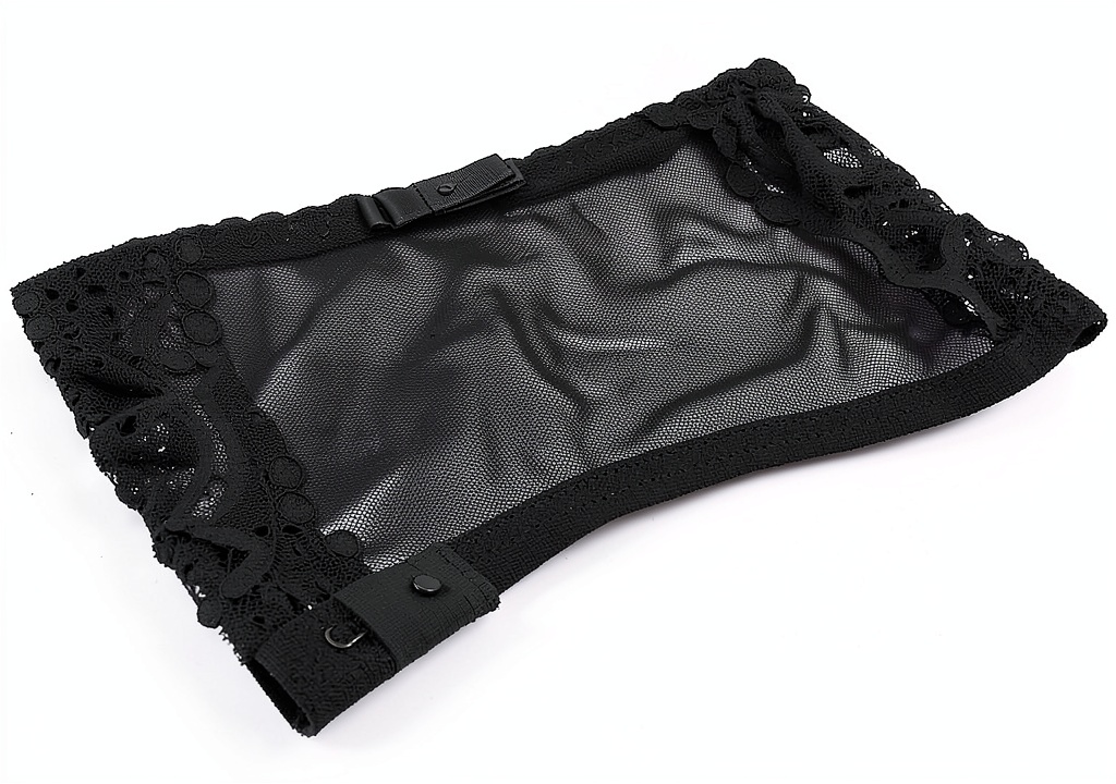 La cintura è realizzata in tessuto a rete di nylon e poliestere, con un pizzo lavorato che assicura delicatezza e resistenza, ideale per un uso prolungato senza irritazioni.
